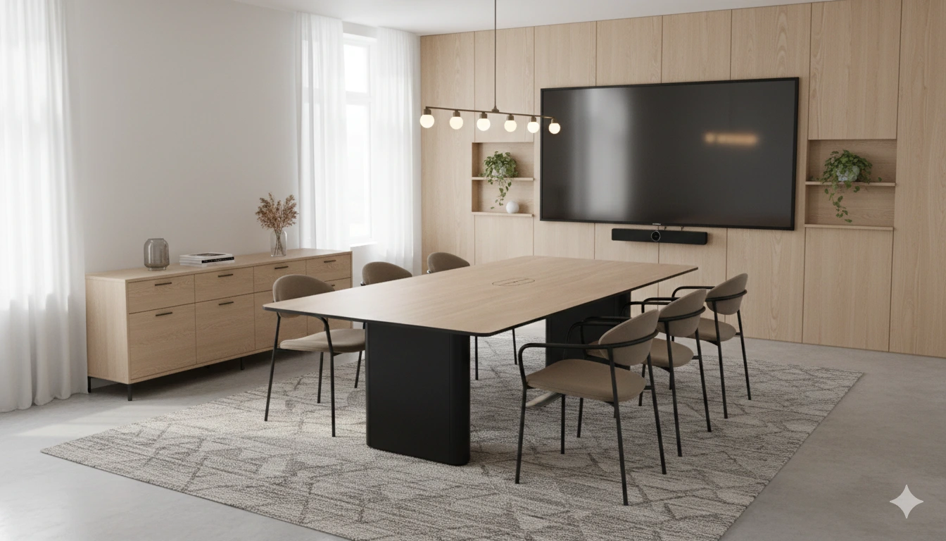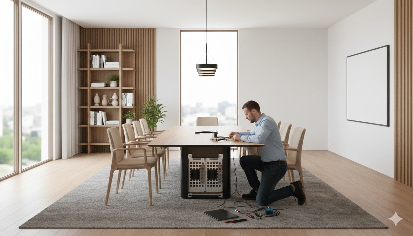 Under bordet finns tydligt organiserade installationszoner där teknik och anslutningar placeras samlat och lättåtkomligt. Installationen blir både snabbare och mer överskådlig, samt skyddad och dold. Det förenklar service, installation och framtida uppgraderingar och påverkar ej rummets estetiska uttryck.