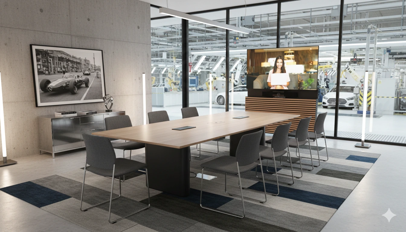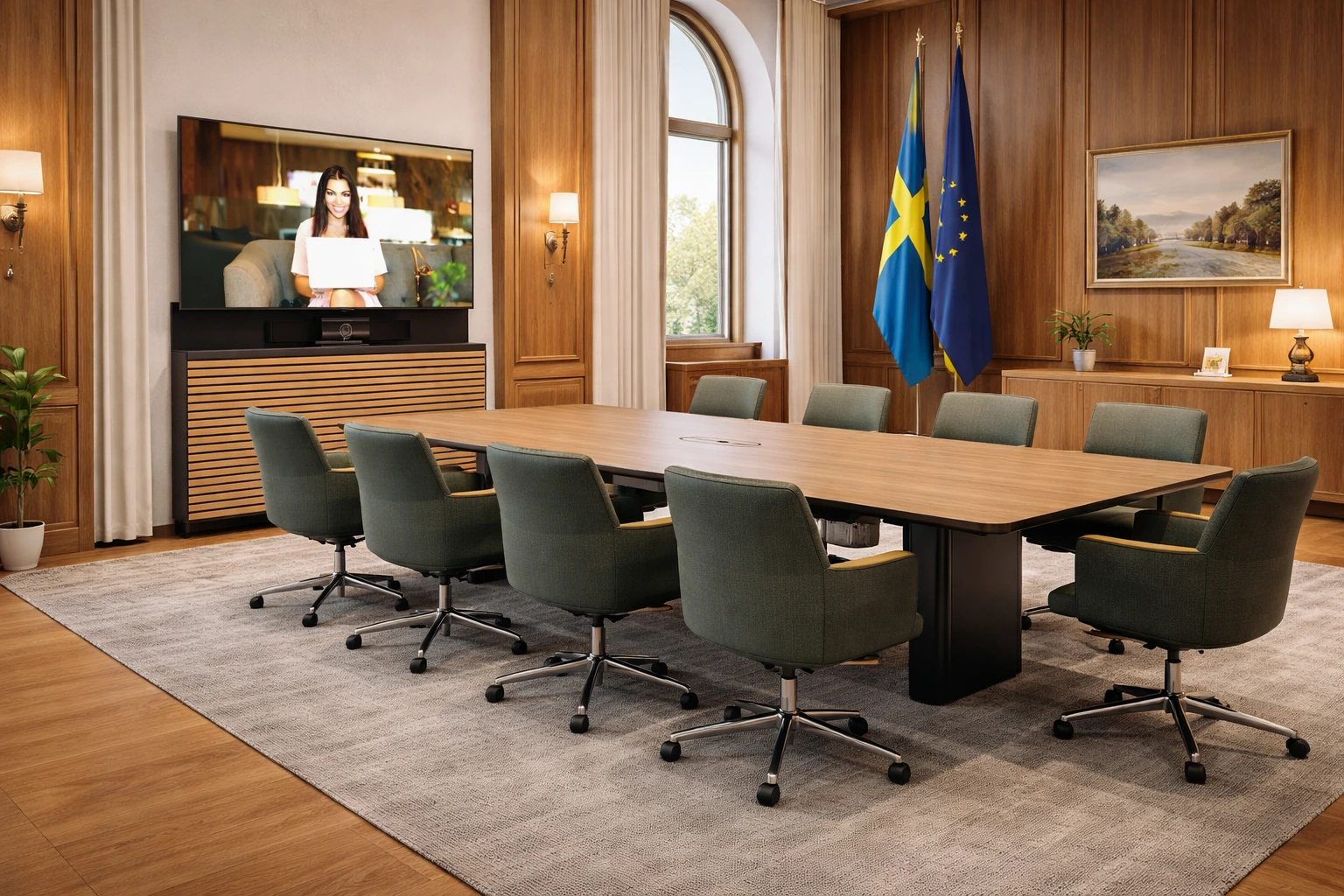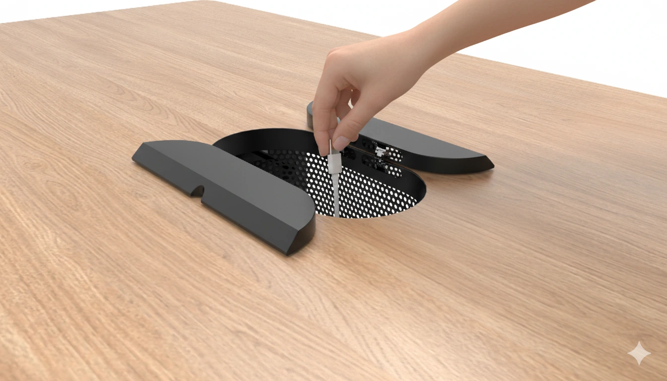 Det centrala kabeluttaget gör det snabbt och smidigt att ansluta dator eller annan utrustning direkt vid bordet. Kablarna lyfts fram endast när de behövs och försvinner lika enkelt tillbaka under ytan, vilket ger en ren arbetsyta utan synligt kablage. En lösning som kombinerar användarvänlighet med genomtänkt design.