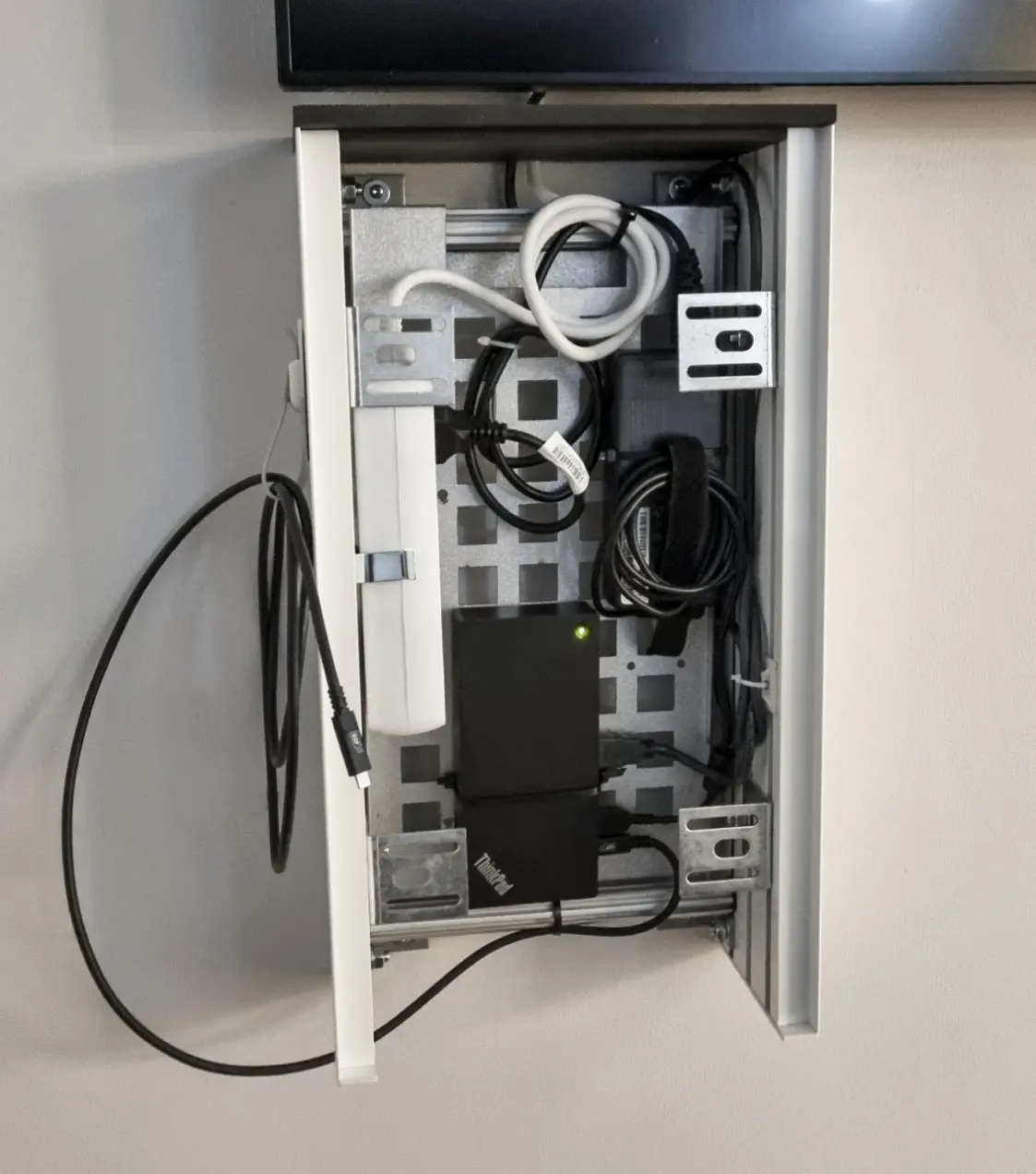 - Döljer och organiserar kablar samt utrustning under skärmen